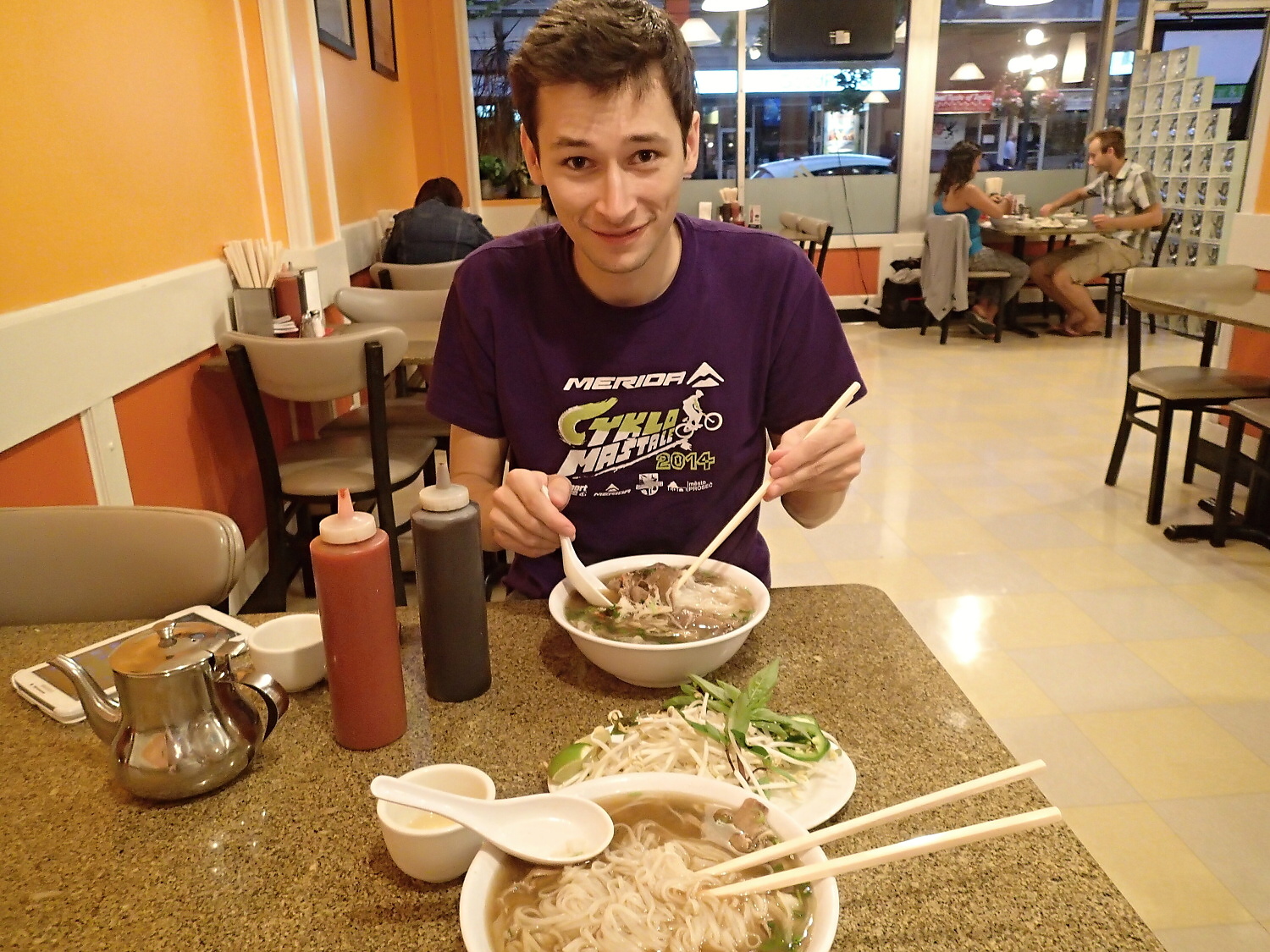 Mount Douglas pro mě bude v budoucích měsících asi častým běžeckým cílem. Leží na okraji města, na které jsou z ní skvělé výhledy. Při pohledu na druhou stranu je potom vidět již nespoutaná kanadská příroda. Až na vrcholu si uvědomuji, že jsem od posledního jídla v letadle do Seattlu nic nejedl, což dělá asi 9 hodin. Proto mi Joel navrhuje, že se na večeři zastavíme v jeho oblíbené vietnamské restauraci.