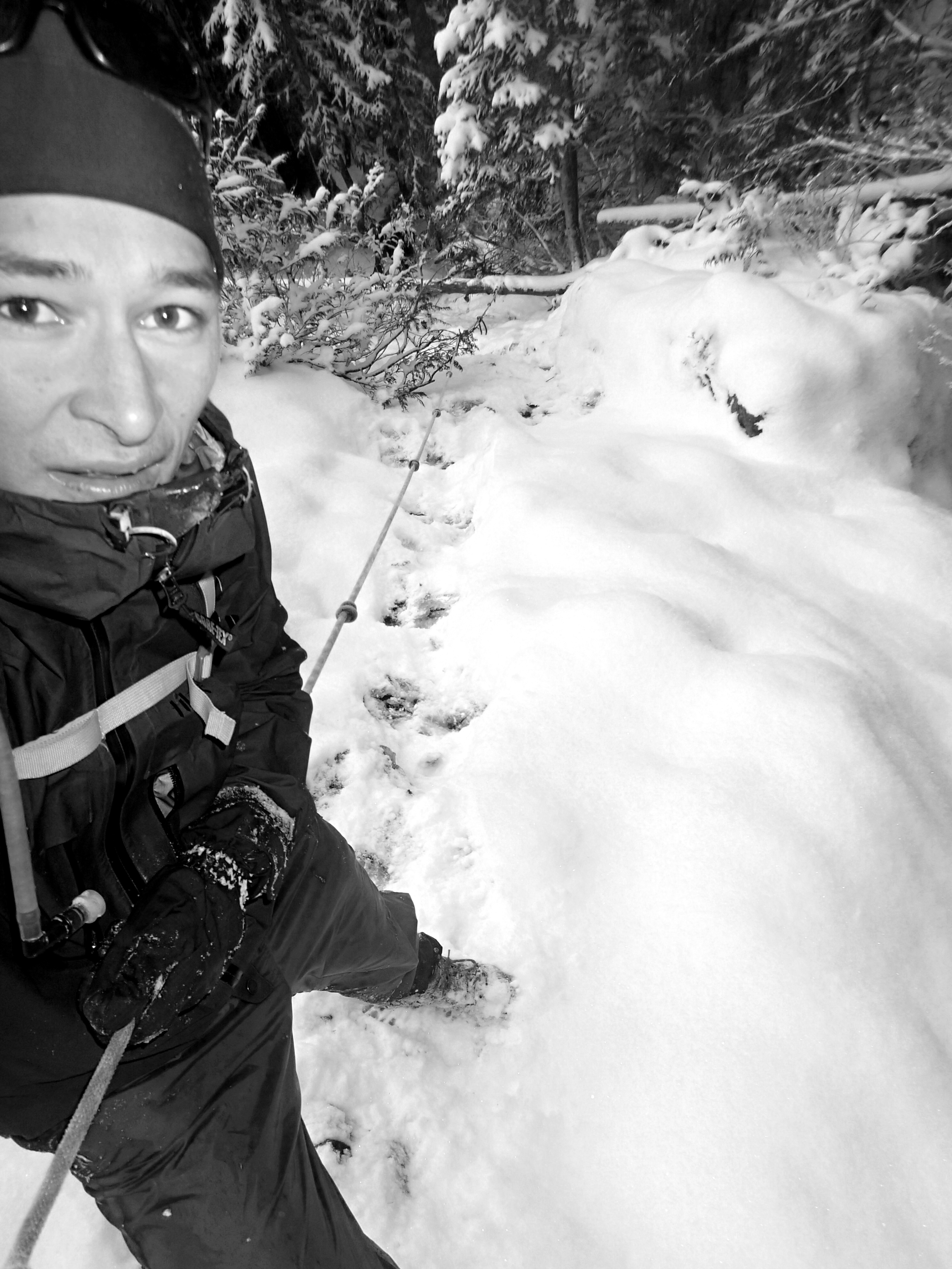 Důkazem terénu a sklonu může být fakt, že fixní lana byla natažena i v některých lesních pasážích. Bohužel postupem času začal i led a technické pasáže a já jsem se v maratonkách opravdu dobře necítil. Kvůli tomu, že jsme počítali s trekovací trasou a ne lezeckou, tak jsme tentokrát s sebou neměli ani cepín ani mačky. Nakonec jsme vylezli do sedla pod vrcholem ve výšce cca 1580 metrů nad mořem a tam se rozhodli raději otočit.