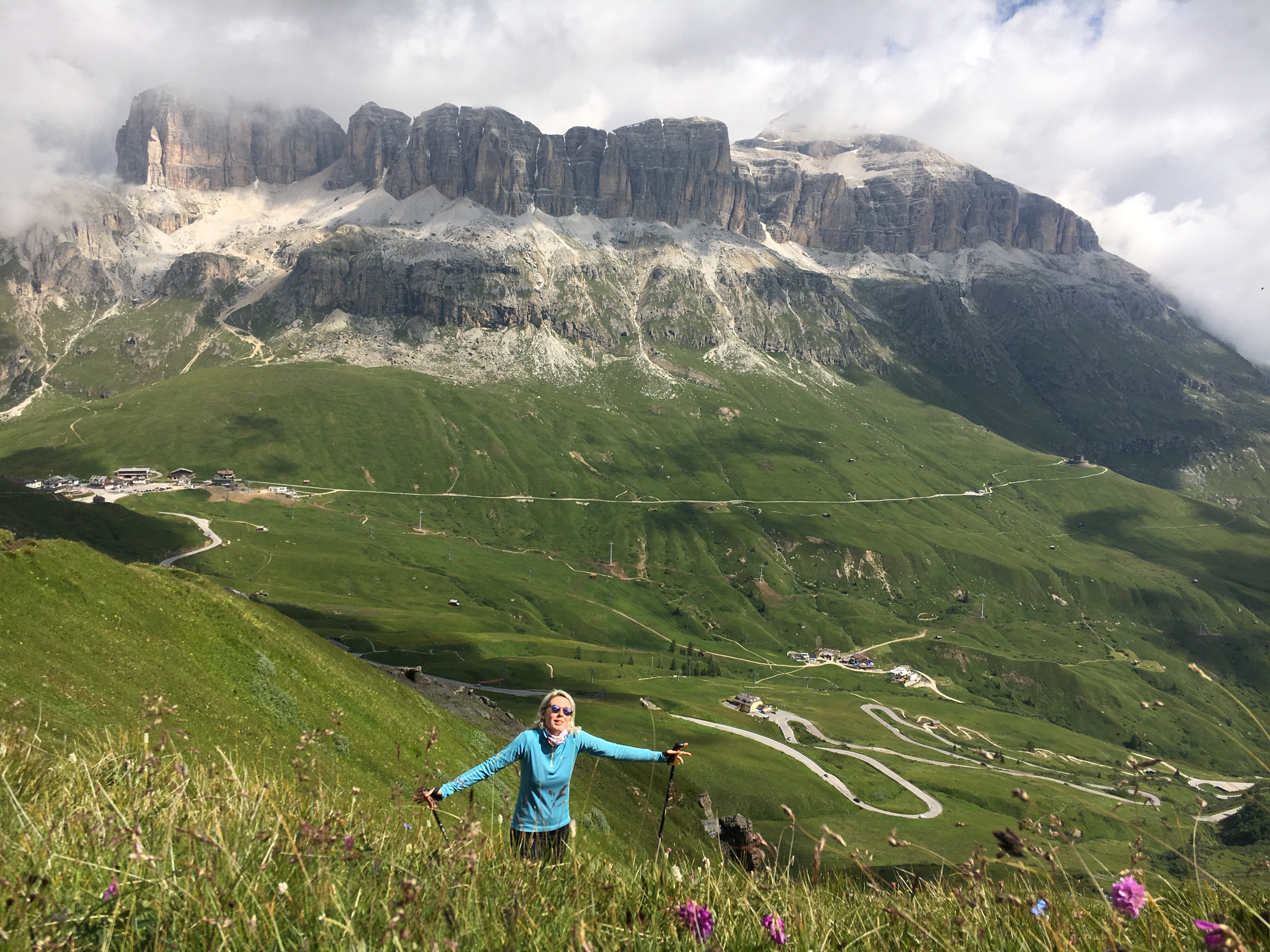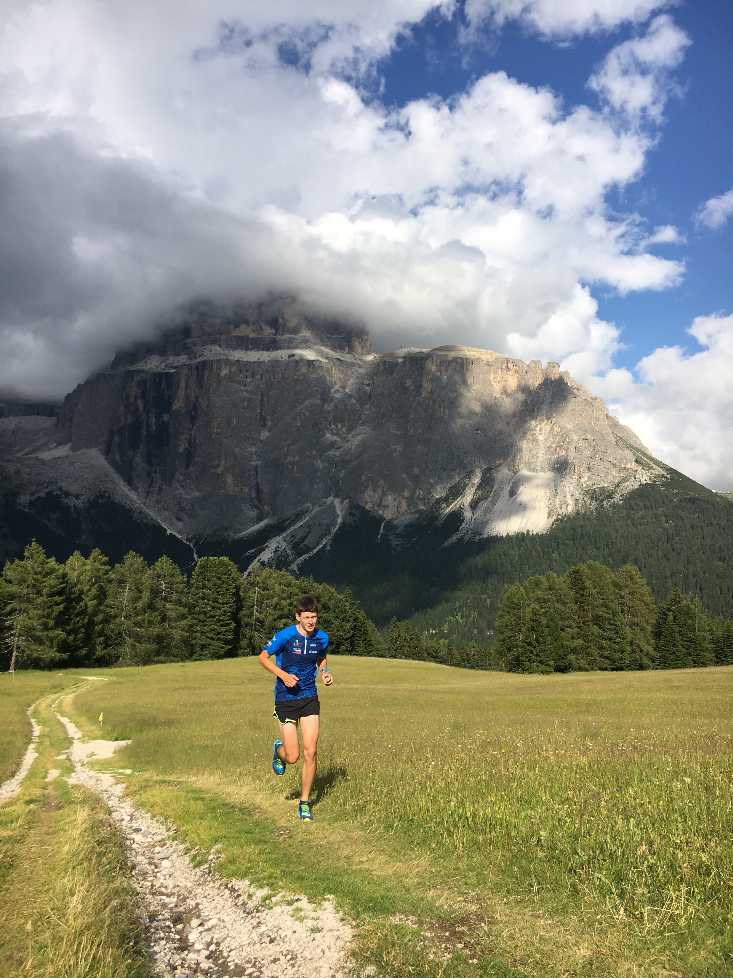 Z kopce se to nepere tak na krev, jako při kratších skyrace závodech a díky tomu se držím ve skupince a ani v seběhu neztrácím. Od sedla Sella běžím s nějakým malým Italem, má snad 160 cm a stehna jako věstonická venuše. Nahoru buší s holema neuvěřitelnou frekvencí. Při průběhu Selvou po rovině ale nechápu, že je s touto neatletickou postavou schopný všechny rovinaté úseky běžet pod 4min/km. Nemůžu se na to dívat a zrychluju. V dalším dlouhém stoupání na Passo Gardena do 2280 mnm mne ale strojovým tempem zase docvakává a strávíme tak “na provaze” další dvě hodiny.