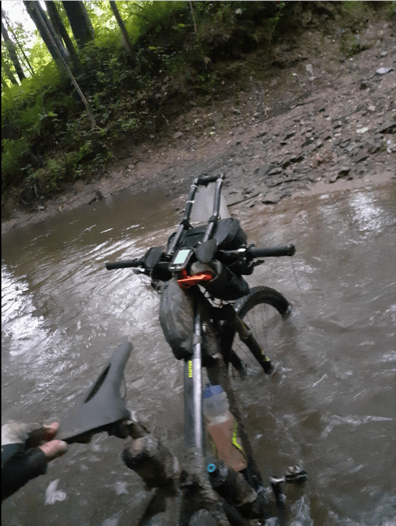 Brodím se s kolem bahnem, které postupně volně přechází do rozvodněné řeky. Po pádu a bloudění mi skupinka závodníků na čele ujela, za mnou velká mezera. Asi mě přemáhá zima a samota, říkám si, co tady v tom dešti a bahně vlastně provádím. Do cíle mi zbývá už jen 242 km, paráda… Z blouznění mne budí opět pípající notifikace hodinek “Off route” – do prd***, v řece skoro po pás se s kolem nad hlavou otáčím a brodím se zpět hledat správnou odbočku… Směju se sám sobě, že mě nenapadlo, že řekou by to přece organizátor nevedl. Během nadcházejících hodin jsem ale zjistil, že ano – vedl.
